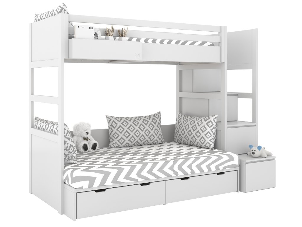 Biela poschodová posteľ s dvoma lôžkami SIMONE s úložnými schodmi a policou 90x200 cm, 120x200 cm