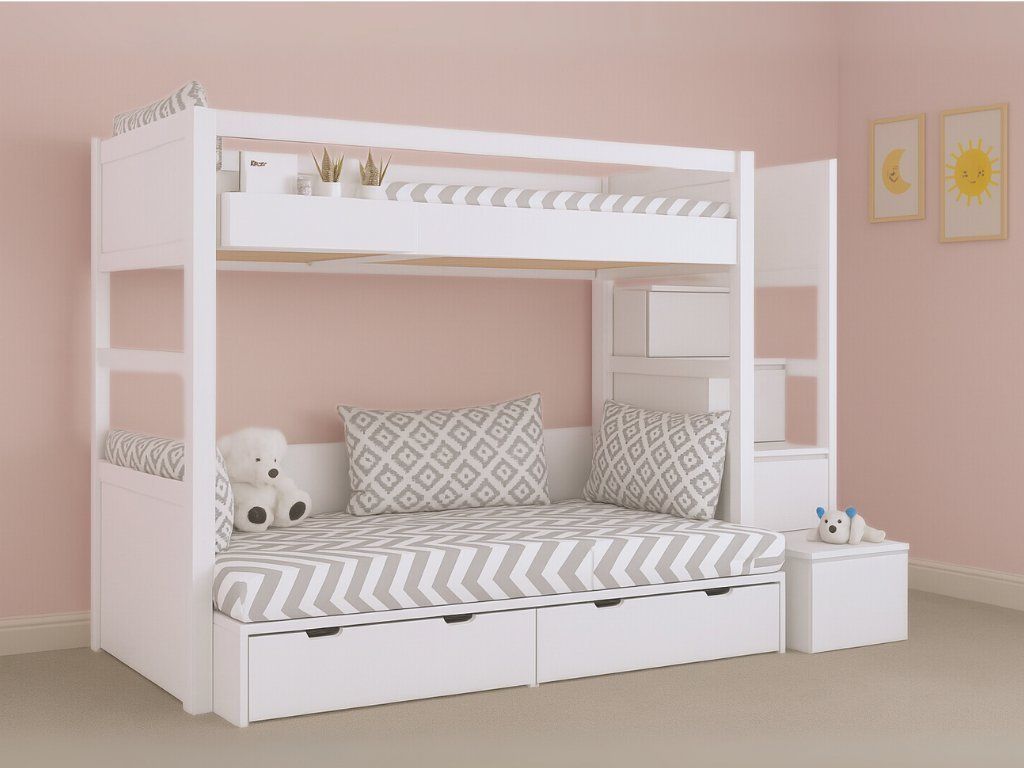 Biela poschodová posteľ s dvoma lôžkami SIMONE s úložnými schodmi a policou 90x200 cm, 120x200 cm