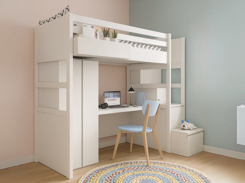 Biela vyvýšená posteľ SIMONE s úložnými schodmi, skriňou, písacím stolom a policou 90x200 cm