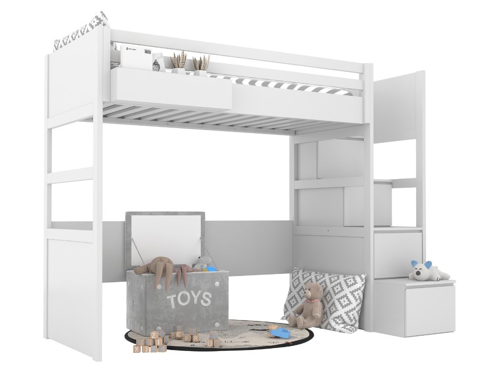 Biela vyvýšená posteľ SIMONE s úložnými schodmi a policou 90x200 cm