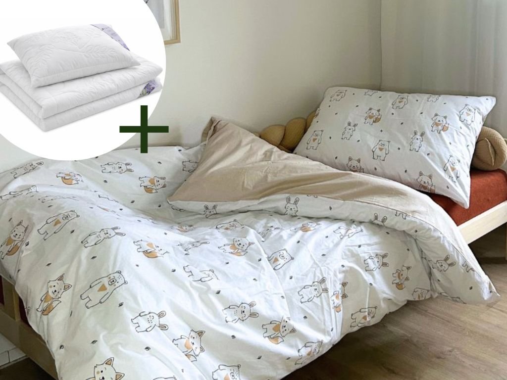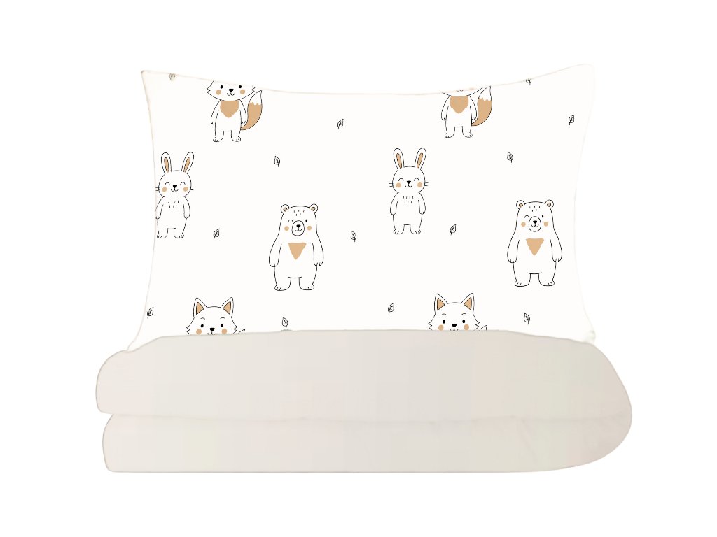 | Sada obsahuje: | 1x Celoročný levanduľový vankúš a prikrývka pre deti, 1x bavlnené obliečky LESNÉ ZVIERATÁ (obliečka na vankúš a prikrývku) |