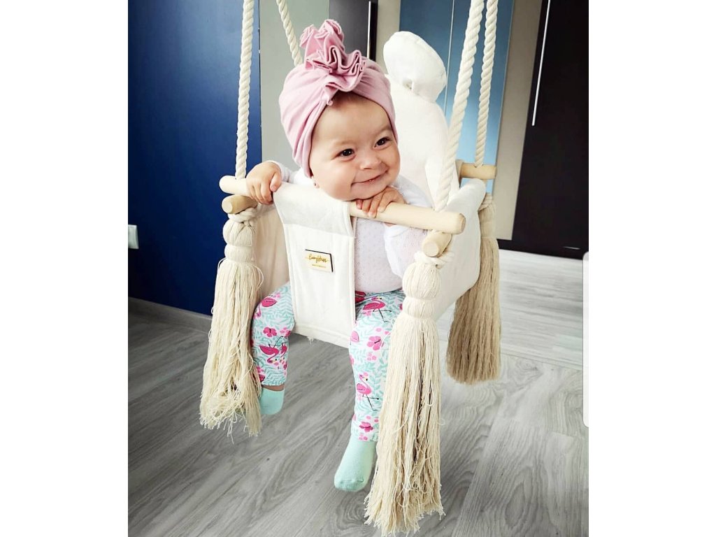 Detská závesná hojdačka s opierkou a strapcami v bielo-krémovej farbe urobí radosť batoľatám aj väčším deťom. Je bezpečná a pohodlná, chvíľky v nej si užije potomok aj vy. Pravidelným hojdaním pomáhate rozvíjať jeho motoriku i rovnováhu, navyše sa vďaka nemu ratolesť počas krátkej chvíľky upokojí.