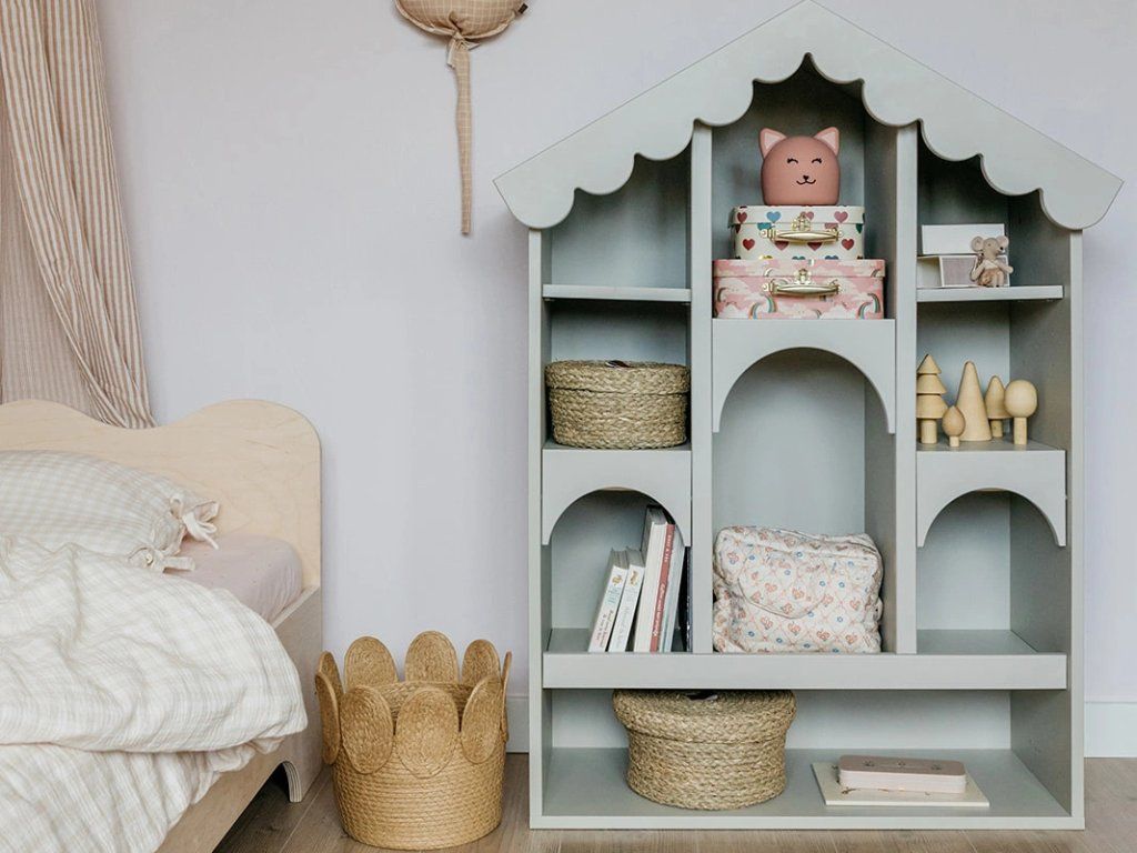 Drevená knižnica BABUSHKA do detskej izby v tvare domčeka olivová