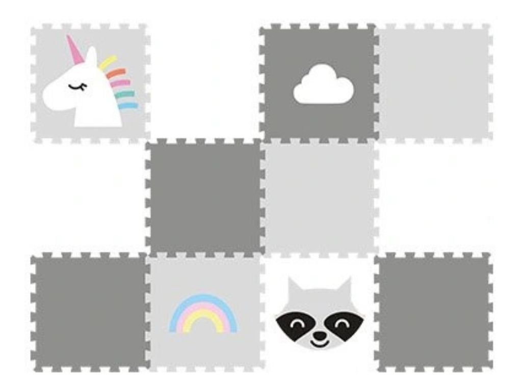 | Sada obsahuje: | 12 podlahových dielov (3 ks bielej, 3 ks šedej, 2 ks svetlo šedej, 1 ks jednorožec, 1ks mráčik, 1 ks mýval, 1ks dúha) |