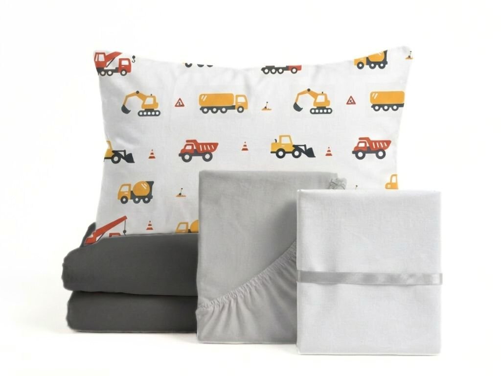 Sada posteľnej bielizne; bavlnené obliečky AUTÁ + svetlosivé jersey prestieradlo + chránič matraca