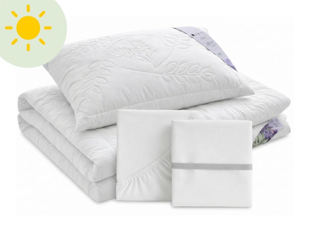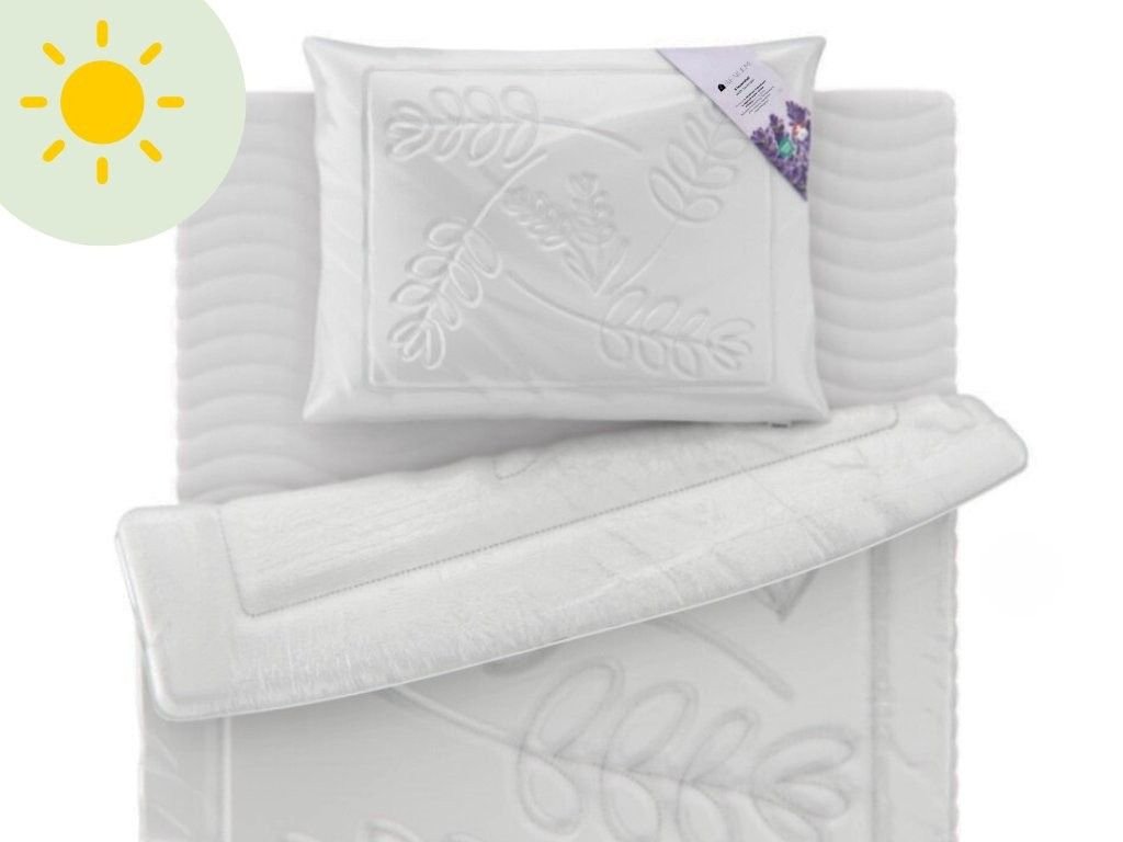 | Sada obsahuje: | 1× vankúš 70×90 cm a prikrývku 140×200 cm, 1× biele prestieradlo, 1× chránič matraca |