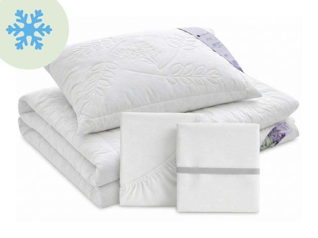 | Sada obsahuje: | 1× vankúš 70×90 cm a prikrývku 140×200 cm, 1× biele prestieradlo, 1× chránič matraca |