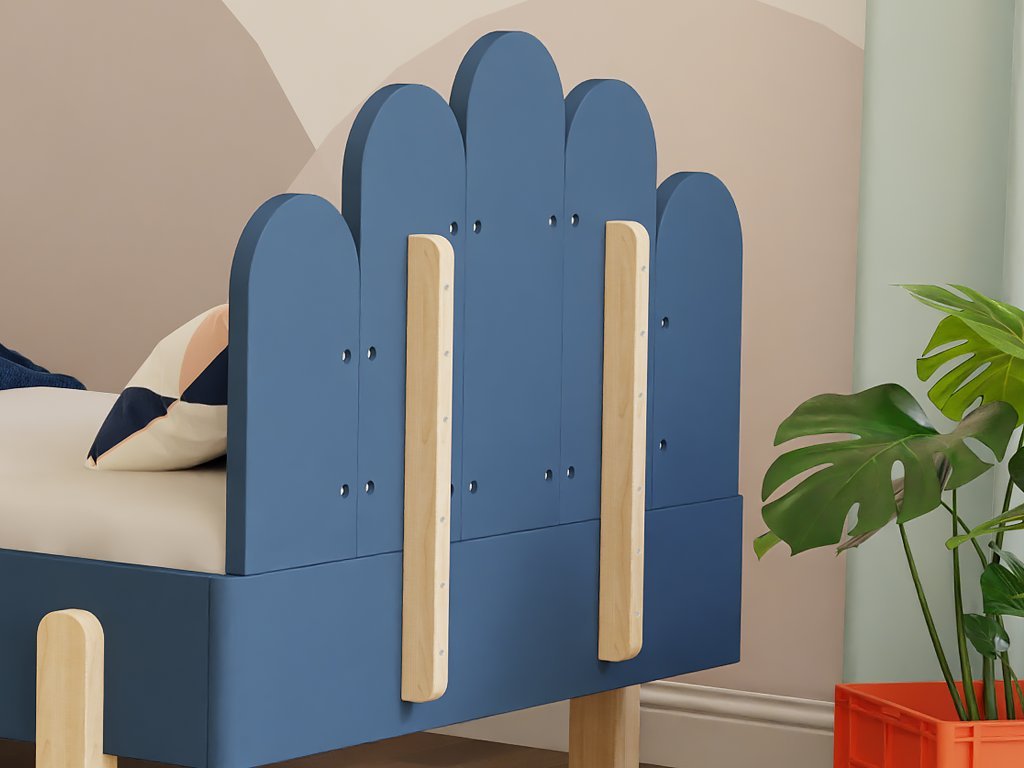Svetlomodrá jednolôžková posteľ NOVA s oblúkovým čelom, zábranou a rovnými nohami 90x200 cm