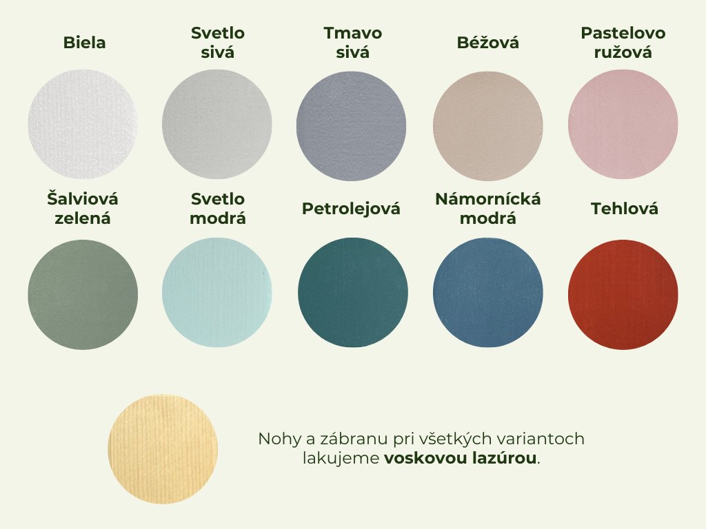 | Lakovanie: | EKO farby na vodnej báze vhodné pre detský nábytok aj hračky |