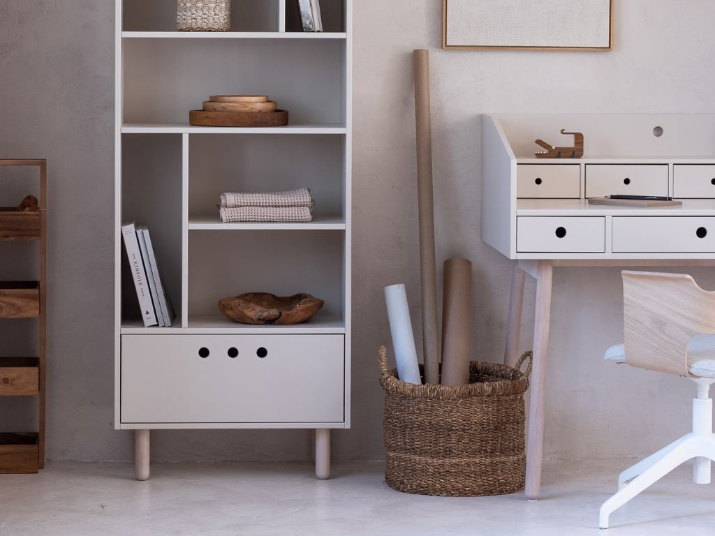 Vysoký drevený regál so šuplíkom do detskej izby RIVER béžový
